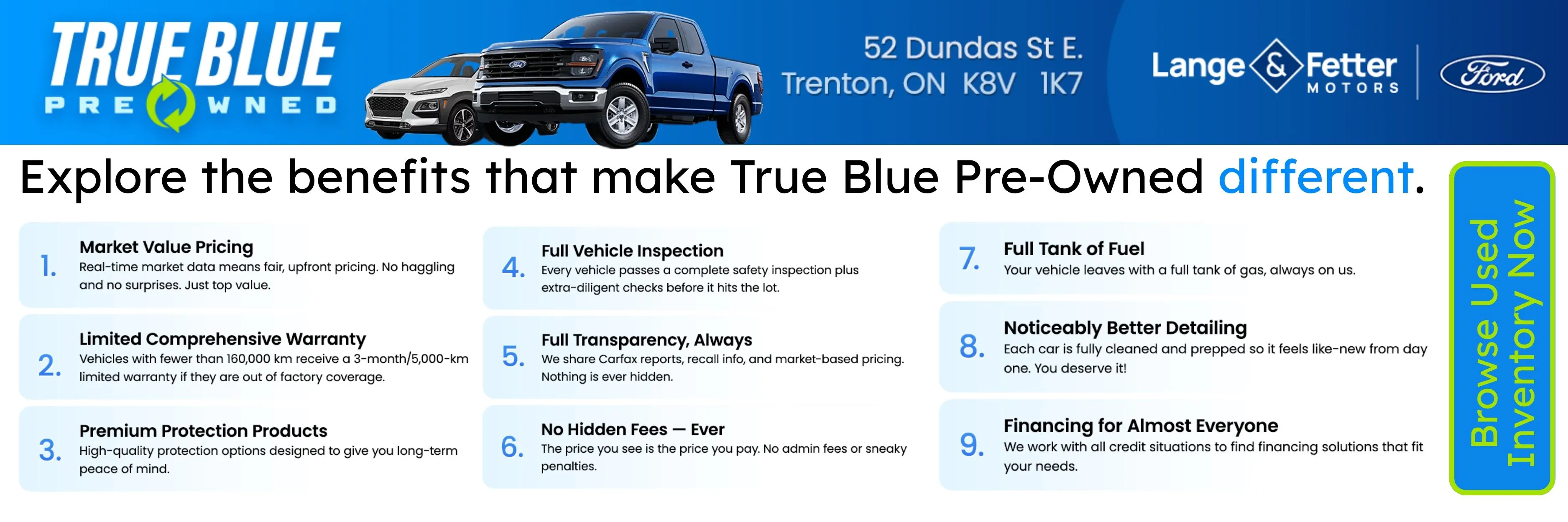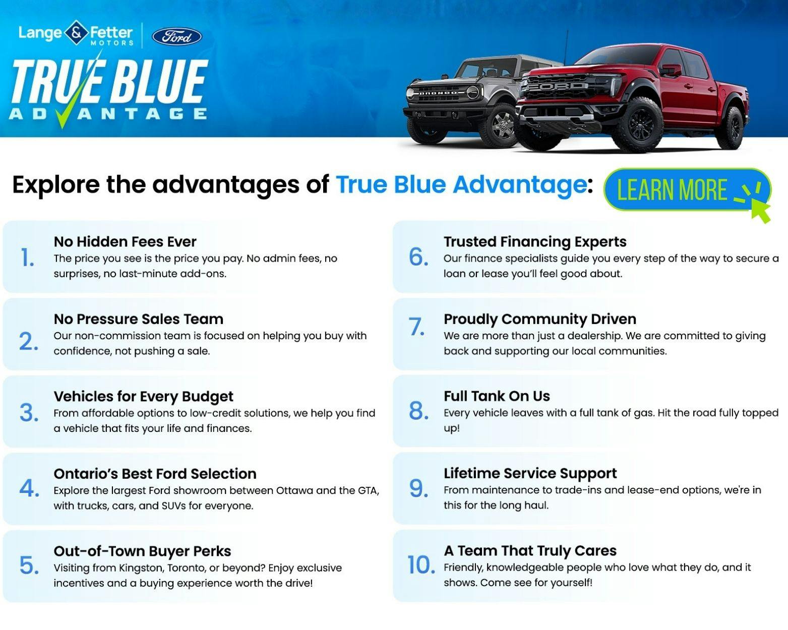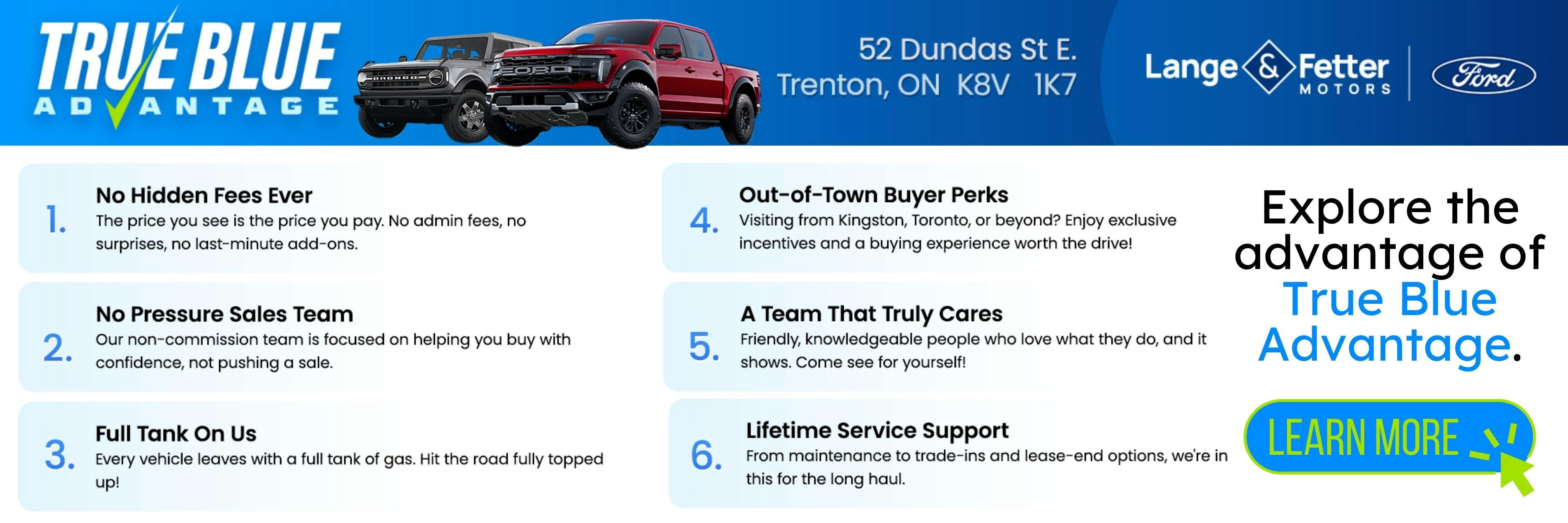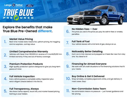 The Lange & Fetter True Blue Advantage is our promise that you won't find better vehicle selection, prices, or services anywhere else. We're here to support you for the long haul as the car dealership you deserve!